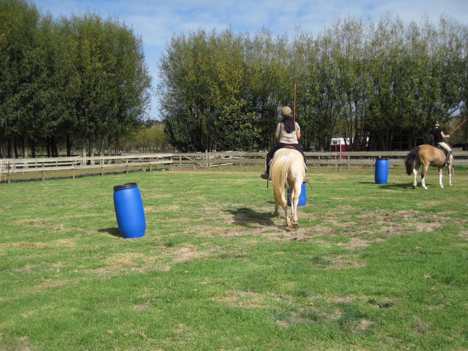 It's all about only having one rein and not swapping sides to turn the opposite way to the side the rope is on. The aids to turn therefore are, eyes, hips bellybutton, leg, REIN, then back up with carrot stick.